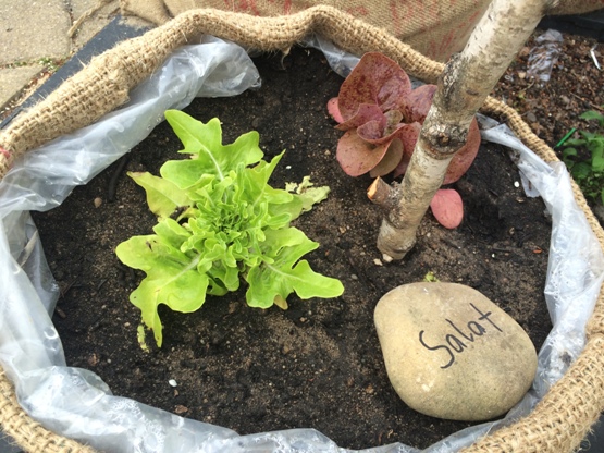 - große Kaffeesäcke wurden mit Obst, Gemüse und Kräutern beplanzt, die jeder! ernten darf