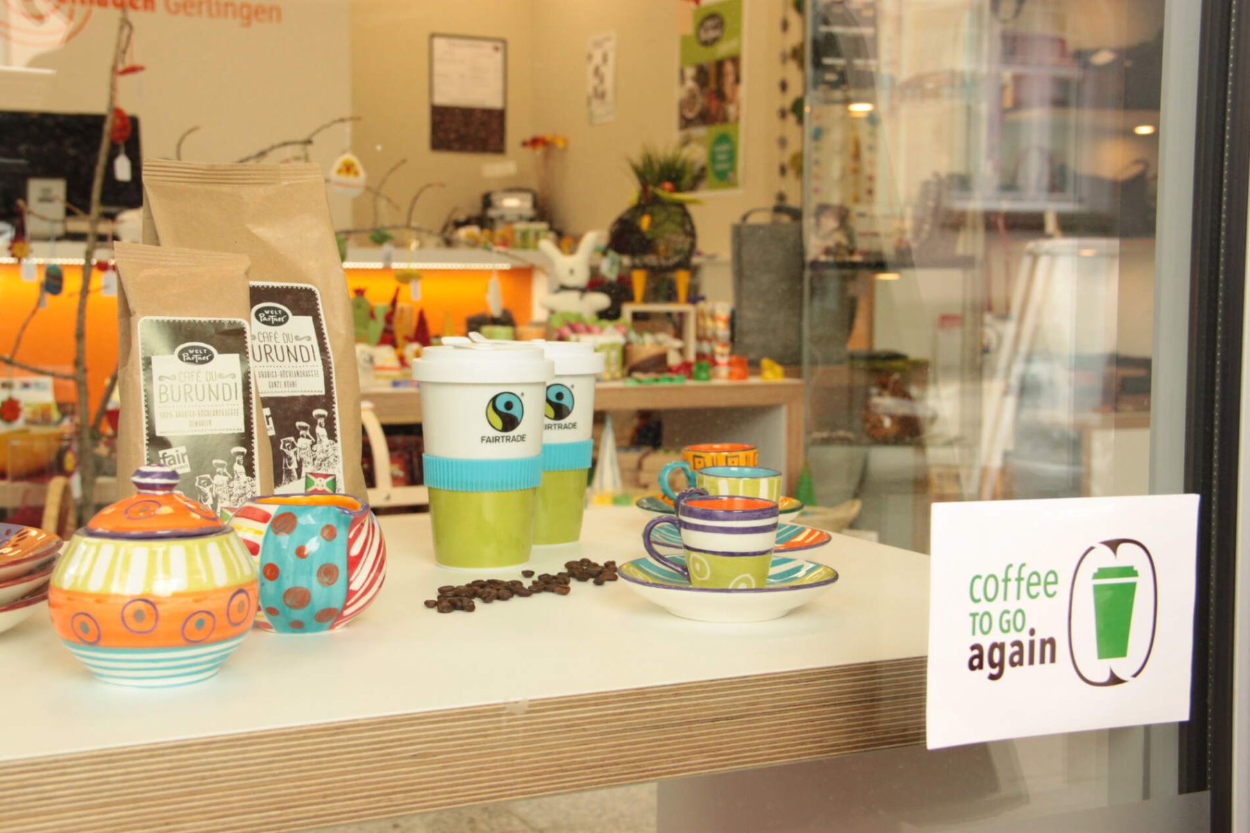 Mit dem Logo der Kampagne zeigen Cafés und Bäckereien ihre Teilnahme an der Aktion und schenken Kaffee auch in selbst mitgebrachte, saubere Mehrwegbecher der Gäste aus. In Erlangen wird Coffee to go again als Modell von der Stadt umgesetzt: Jedes Geschäft, das sich beteiligen möchte, erhält kostenlos den Aufkleber bei der Abfallberatung in der Schuhstraße 40.